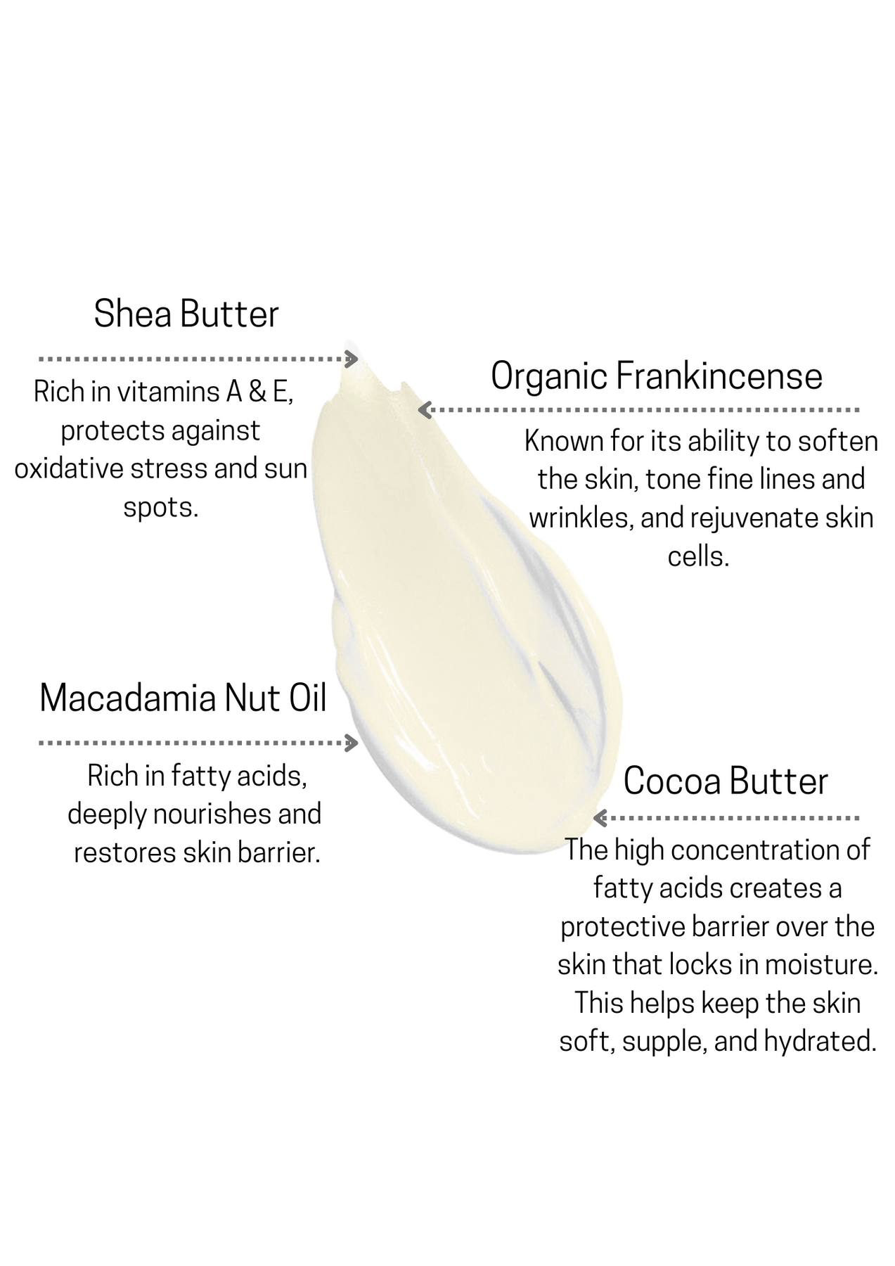 Toning & Firming: Infused with organic frankincense, this moisturiser promotes skin elasticity and firmness. Known for its rejuvenating properties, frankincense helps to refine the skin's texture, leaving it looking visibly tighter and more youthful.