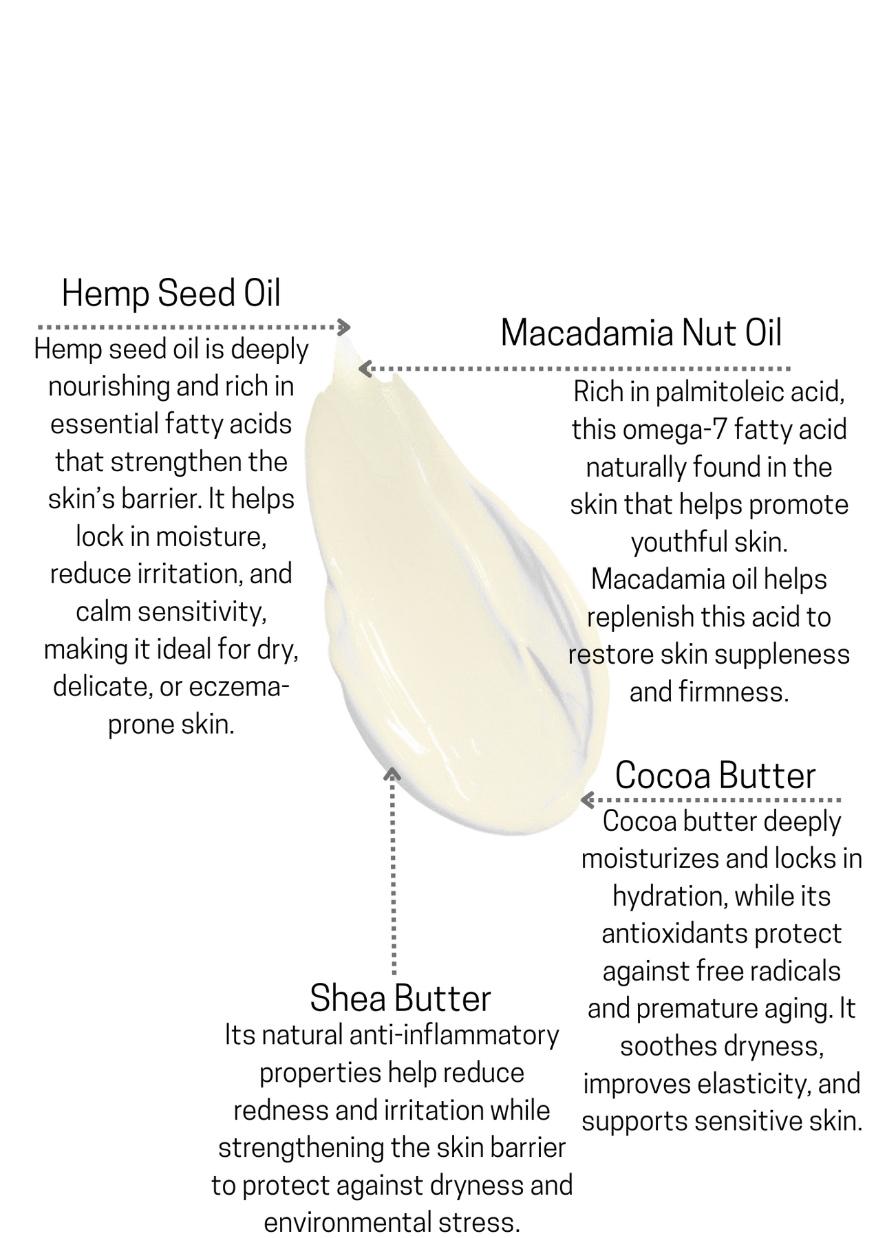 In addition to hemp oil, we've added organic macadamia nut oil, which is rich in palmitoleic acid—a naturally occurring fatty acid that’s particularly beneficial for the skin. This oil helps to restore moisture, prevent water loss, and promote skin softness. It’s easily absorbed, ensuring your skin stays smooth and well-hydrated without feeling greasy.